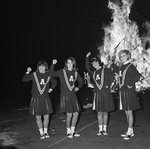 Image shows four Arlington State College cheerleaders performing a yell at the annual bonfire. Left to right, Susie Wine, Patty Kalan, Sally Soldo and Cindi Coulson. Published in Fort Worth Star-Telegram morning edition November 1, 1966.
