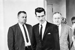 Kenneth Allen McDuff, flanked on left by Earl Brown, chief deputy sheriff, and on right by Sheriff Lon Evans, enters Criminal District Court after jurors reported they had reached a verdict in his trial.
