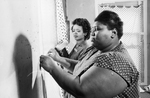 Mrs. Lillian McDowell of 5524 Carver Drive, foreground, is shown by Mrs. Bernice Hollins how to put plastic over windows that no loner will hold glass. New properly hung curtains are among the improvements Mrs. McDowell's home is undergoing. The house how has no utilities. Published in Fort Worth Star-Telegram evening edition February 17, 1967.