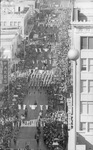 Stock Show parade on Houston St. between 2nd and 3rd streets in downtown Fort Worth showing store signs that include: Leonard's department store, Klar Jewelry, Red Goose Shoe Store, Fakes, Woolworths, 01/28/1967