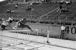 Wade Williams of Fort Worth Kirkpatrick (right) clears final hurdle en route to winning his heat in the 120-yard high hurdles event. Williams qualified for the high school finals, as did Bob Massey of Captiol Hill, Oklahoma (left). Both hurdlers clocked 15.0 in race. Published in Fort Worth morning edition March 4, 1967.