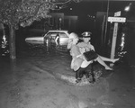 Drier ground, Patrolman J. A. Bennett carries Miss Molly Stowe after she was stranded in high flood waters, 04/21/1967.