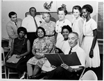 Neighborhood center programs now in operation under the Community Action [Agency] Program are being directed by Mrs. Wilma Lightner, Mrs. Vassie T. Tinsley, Mrs. Dorothy P. Miller, and Louis Dressler, front left to right, and J. Martin Marquez, B. T. W. Brembry, Miss Josephine Beckwith, Mrs. Lacy Goostree, Mrs. Sybil Dodson, and Mrs. Robbie Lewis, back. Miss Beckwith is director of Bethlehem Center, administrator of the Community Action Program project; Mrs. Goostree is a member of the center board and Mrs. Sybil Dodson is program director. The others are neighborhood directors. Published in the Fort Worth Star-Telegram morning edition, June 29, 1967.