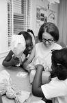 Peggy Dillard, 16, and the 8-and-9-year-old girs shes supervises are having a fun summer at the Bethlehem Community Center. The girls seem overwhelmed by the fact that Peggy can turn an ugly brown sack into an imaginative looking puppet. Published in Fort Worth Star-Telegram evening edition July 21, 1967.