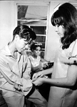 Pete Vargas gets button sewed on by Dora Cabral as Dortohy Gonzales takes turn at sewing machine. Sewing classes are one of the youth activities conducted at Santo Nino Cathechist Center. Published in Fort Worth Star-Telegram morning edition July 26, 1967.