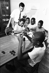 Al Garcia, staff worker, supervises game at Riverside Neighborhood Center. Left to right, are Mary Howard, 10; Nolan Hightower, 6; Willie Miller, 7; Odell Coleman, 12, and Louis Bell. Published in Fort Worth Star-Telegram morning edition July 26, 1967.