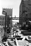 In the picture you can observe the on going construction at Sixth Street of the overpass that will connect Star-Telegram building at 7th street and Taylor. There is a crane on the right side of the picture, and the metal structure is horizontally positioned, there is a man walking through it. There is a lot of metal on the floor surrounding the crane, and there are three buildings in the background.