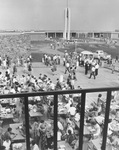 Tarrant County Junior College (T. C. J. C.) South campus, showing students eating outside in open courtyard area, shot taken from student center nearing completion, September 18, 1967