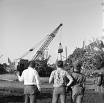Image shows University of Texas at Arlington students watch a crane stack scrap wood and lumber for the school's homecoming bonfire. The fire will be ignited after a nighttime parade. Published in Fort Worth Star-Telegram morning edition November 3, 1967.