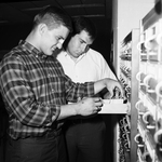 The game with Lamar Tech will decide the Southland Conference champion is occupying the minds of The University of Texas at Arlington grid men, but there's still studying to be done. Jerry McLaughlin of Weatherford (left) and Danny Griffin of Cleburne are in the library for research. Published in Fort Worth Star-Telegram evening edition November 15, 1967.