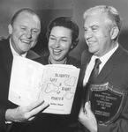 Marvin Garrett, Mrs. Mona Hunter, and George Dolan holding book "Slightly left and right of center," 11/18/1967