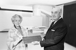 William Alvin and Elizabeth Moncrief in a radiation room at the Fort Worth Radiation Center. The Moncriefs donated money to purchase a Mevatron linear accelerator for the Center.