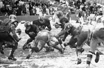 Quarterback Mike Baylor (10) of the UTA (University of Texas at Arlington) Rebels braces himself on slippery turf after taking handoff. Other UTA Players are Richard Norwood (50), Greg Bailey (70) and Bob Diem (63). Rebels scored 13-0 victory over North Dakota State on frozen turf in Abilene's Pecan Bowl game. Published in Fort Worth Star-Telegram morning edition December 17, 1967.