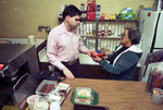 A photograph of Randy Medlin, a blind employee at a snack bar, working in the Tarrant County Courthouse. He has learned to match names to the voices of at least 50 employees and regular costumers.