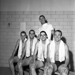 Four members of The University of Texas at Arlington swimming team, seated from left to right are Ernie Seifert, Charlie Smith, Rick Nesbit, and Doug Russell. Standing behind them is head coach Don Easterling.