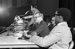 Manuel Jara, chairman of the Community Action Agency, speaks at a Community Relations Commission meeting at Will Rogers auditorium as Gene McIntyre, right, and Clarke Gillespie, center, listen. Published in Fort Worth Star-Telegram morning edition April 13, 1968.