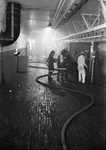 Firemen and employees of Swift & Company in the stockyards with oxygen masks and goggles enter smoke filled packaging department, 04/19/1968