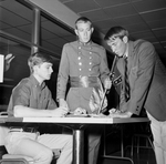 Image shows UTA students, left to right, Scott Taylor, Robert Hale and Randy Kildow. Robert Hale is the outgoing "Johnny Reb" spirit symbol at UTA . While Taylor is the newly elected one. They are taking part in a petition signing for a campus wide election at The University of Texas at Arlington. Published in Fort Worth Star-Telegram evening edition May 1, 1968.