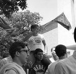 Image shows a student in top of the shoulders of another student during a demonstration on The University of Texas at Arlington campus. They are wearing UTA swimming t-shirts, waving and wearing confederate flag symbols in demonstration to protest the ruling to banish the rebel theme from campus. Published in Fort Worth Star-Telegram evening edition May 2, 1968.