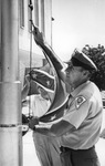 University of Texas at Arlington (U. T. A.) Campus Policeman M. F. Britain lowers the Rebel Flag for last time, 06/29/1968