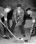 Fort Worth Wings all-league defenseman Irv Spencer instructs Jon Kopacki (left) and Gary Cook, 13-year-olds attending junior hockey clinic at Will Rogers Coliseum.