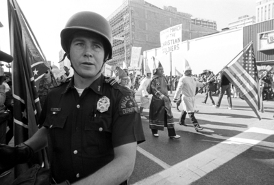 • Dallas police officer at Ku Klux Klan march in downtown Dallas by Rodger Mallison
