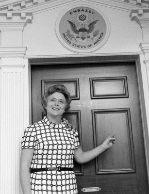 Barbara Bush standing in front of a United States Embassy door labeled "42 A"