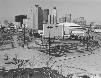 Aerial of newly completed Fort Worth Water Gardens with Convention Center