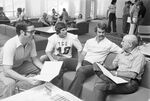 Texas Christian University (TCU) football players Steve Patterson, second from left, and Rusty Putt, second from right, talk with Fort Worth Star-Telegram sports writer Jim Trinkle during a tour by Southwest Conference writers. At left is TCU's sports information director, Jim Garner.