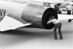 A boy closely inspects the engine turbine of a military jet on static display at the Dallas-Fort Worth Regional Airport dedication.