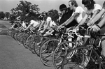 Students from 25 area high schools line up for bike races, part of the second annual November fest sponsored by The University of Texas at Arlington for students of German descent. The festivities included a band contest, root beer guzzling and folk dancing. Published in Fort Worth Star-Telegram morning edition November 11, 1973.
