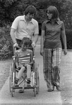 Stan Richardson, district director for Fort Worth Muscular Dystrophy Association, pushes James Clark, age 11, at the week-long summer camp sponsored by Muscular Dystrophy Associations of Dallas and Fort Worth, held at Athens, Texas. Next to Mr. Richardson and James walks an unidentified woman. They can be seen in a sidewalk, James is wearing a striped tank top, Mr. Richards is wearing a short sleeve polo shirt and shorts, the unidentified woman is wearing a short sleeve polo shirt, plaid pants, and eyeglasses.