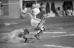 Image shows a baseball game between UTA and Sul Ross. Left, Sul Ross's Eddie Duarte breaks up a bid for a double play by UT- Arlington's catcher, Matt Skinner, right. Duarte was forced out in the fourth inning of the first game. Published in Fort Worth Star-Telegram morning edition March 21, 1985.