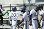 Baseball, Texas Christian University (T. C. U.) vs. Southwestern University; Texas Christian University (T. C. U.)'s Brent Barker (#10) with teammates. The athletes can be seen wearing, their white and purple uniforms.