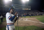 Image shows Country star Charley Pride singing the national anthem, in baseball uniform at the Major League Baseball Ranger's home opening game. Published in Fort Worth Star-Telegram morning edition April 13, 1985.