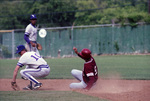 Baseball, Texas Christian University (T. C. U.) vs. Arkansas; Texas Christian University (T. C. U.)'s Brent Barker (#10) fields ball for runner sliding into base.