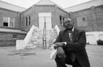 Image shows Ray Bell kneeling in fron of the Prince Hall Masonic Mosque at 2213 E. First St. in Fort Worth. The cross shaped, red brick building with seating for 3,000 people drew big name musicians of the era. The Mosque, or Grand Lodge was the hub of African American social life. The Most Worshipful Prince Hall Grand Lodge, a African American fraternal organization, voted to sell it. Published in Fort Worth Star-Telegram morning edition July 27, 1985.