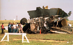 There is a orange cone near the bottom of the wreckage, and a white barrier towards the front left of the photo. Rescue workers are all looking down towards something. Rescue workers around tail section of Delta 191 at Dallas Fort Worth Airport, 08/03/1985