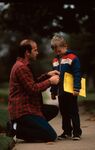 Larry Pedersen with his son, Larry Pedersen Junior. Larry Senior is helping his son zip up his jacket. Larry Jr. is holding a yellow folder with his name written on it. The two are shown outside, on a sidewalk.