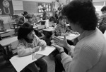 Student Amanda Oei watches deaf interpreter Paula Golem sign what teacher Barbara Macintosih is telling the class at Eastern Hills Elementary School, Fort Worth, 11/06/1985