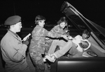 Image show from left to right, three sorority members, Angela Ashley, Rebecca Rodriguez, Jamie Tomlin and Travis Hamilton, in car. The kidnappers are shown helping kidnapped Hamilton out of car. Published in Fort Worth Star-Telegram evening edition November 12,1985.