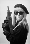 Image shows Karon Gandy, in secret agent costume, holding a toy Uzi. She is a member of UTA's Phi Mu Sorority. Members of the Phi Mu sorority at UTA dressed in military attire to kidnap and hold for ransom student leaders for a ransom of 100 cans of food to be donated to the Tarrant County Meals on Wheels. Published in Fort Worth Star-Telegram evening edition November 12,1985.