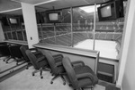 A photograph of the interior of a Texas Stadium suite with a window view over the playing field.