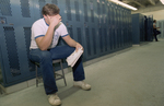 Image shows sophomore defensive tackle, Ed Newman reacting to the news that the University of Texas Football program has been abolished. He is shown to be seated in chair in locker room. Published in Fort Worth Star-Telegram morning edition November 26, 1985.