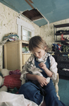 Image shows Amanda Epsy playing with a kitten in her room, where the roof is falling apart. This home is one of the crumbling homes that fall upon 18 home inspectors. Published in Fort Worth Star-Telegram morning edition December 1, 1985.