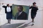 Opal Lee, left, and Brenda Polk carrying a painted banner depicting the likeness of civil rights leader Martin Luther King, Jr. during a memorial march along Rosedale Street in Fort Worth in honor of Dr. King.