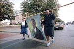 Opal Lee, left, and Brenda Polk carrying a painted banner depicting the likeness of civil rights leader Martin Luther King, Jr. during a memorial march along Rosedale Street in Fort Worth in honor of Dr. King. The Texas Wesleyan University Ann Waggoner Fine Arts Auditorium is visible in the background.