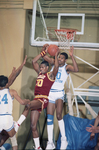 Image shows a basketball game between UTA and Northeast Louisiana. Left, Northeast Louisiana's, Bobby Jenkins, holding ball, takes an offensive rebound away from UT- Arlington's, right, Ronell Peters. Published in Fort Worth Star-Telegram morning edition January 24,1986.