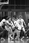 Image shows a basketball game between UTA and Southwestern. Right, UT- Arlington's Page Smithers Wojciak, wearing headband, fights for basketball against Southwestern's Cheryl Sutherland, center and UTA's Tracy Burr, left. Published in Fort Worth Star-Telegram evening edition February 4,1986.