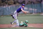 Baseball, Texas Christian University (T. C. U.) vs. North Texas State; Texas Christian University (T. C. U.)'s 2nd baseman Brent Baker tags out NTSU's John Guardino and tries for a double play, 02/19/1986